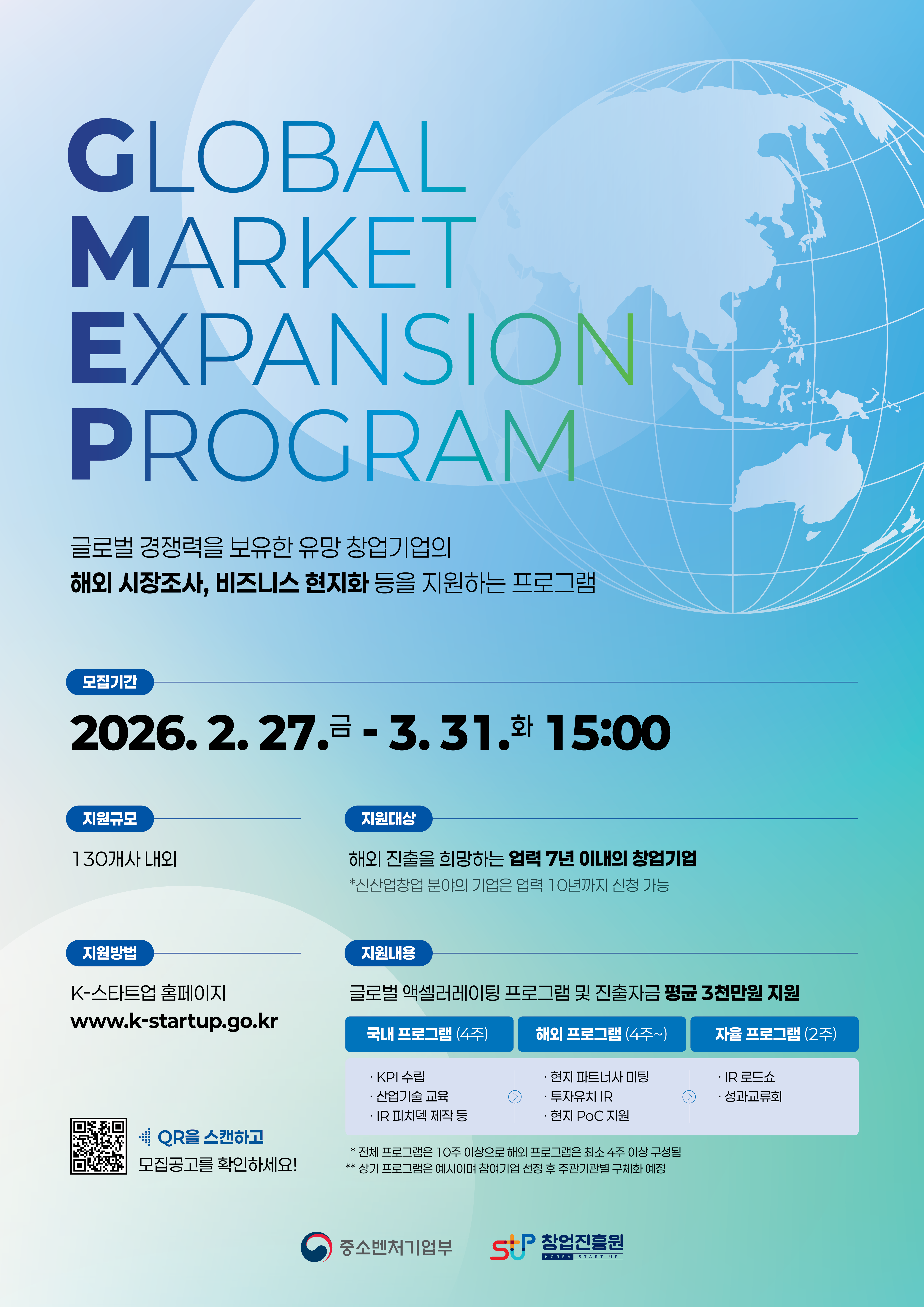 글로벌 경쟁력을 보유한 유망 창업기업의 해외 시장조사, 비즈니스 현지화 등을 지원하는 '2026년도 글로벌 액셀러레이팅(Global Market Expansion Program)'에 참여할 창업기업을 다음과 같이 모집공고합니다.