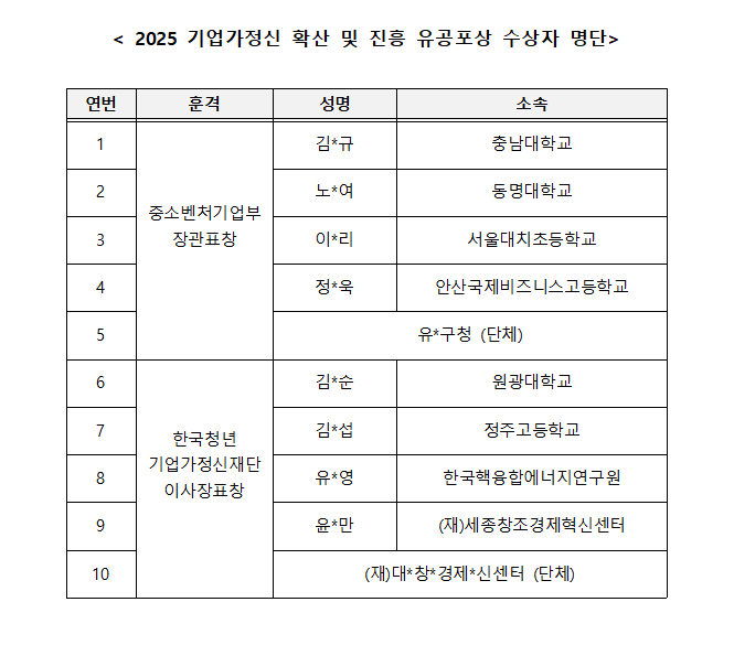 「2025 기업가정신 확산 및 진흥 유공포상」 수상자를 아래와 같이 공지합니다.